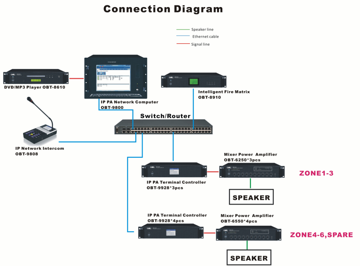 整個系統(tǒng)設(shè)計如下:由于云南宛水公園面積大、覆蓋區(qū)域廣、功能區(qū)域相對獨立,根據(jù)這種特殊場所需求,系統(tǒng)選擇了先進的TCP/IP網(wǎng)絡(luò)廣播系統(tǒng)。IP網(wǎng)絡(luò)廣播系統(tǒng)是一套基于IP數(shù)據(jù)網(wǎng)絡(luò)傳輸?shù)囊纛l擴聲系統(tǒng),它可在同網(wǎng)段的局域網(wǎng)內(nèi)、跨網(wǎng)關(guān)的局域網(wǎng)內(nèi)或Internet網(wǎng)上使用。穩(wěn)定可靠的網(wǎng)絡(luò)廣播直接取決于網(wǎng)絡(luò)服務器及網(wǎng)絡(luò)適配器軟硬件結(jié)合的完好性能。IP網(wǎng)絡(luò)廣播系統(tǒng)是由IP網(wǎng)絡(luò)廣播控制中心、IP網(wǎng)絡(luò)適配器、音頻工作站等組成。系統(tǒng)采用高速的雙CPU處理(32位MCU+16位DSP),數(shù)字功放,延時短(0.1s)音質(zhì)好(20-16KHZ),支持各種音頻格式的數(shù)據(jù)網(wǎng)絡(luò)傳送(MP3、MP2、AAC、WAV),完善的網(wǎng)絡(luò)適應能力,同時支持外接音頻的實時編碼,具有:IP地址自動獲得(DHCP)、直接跨網(wǎng)關(guān)及核心路由交換機的功能、支持互聯(lián)網(wǎng)廣播,網(wǎng)絡(luò)流量自適應等功能。